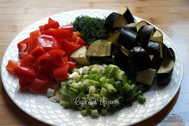 Πλένουμε τα λαχανικά και κόβουμε τις μελιτζάνες και την πιπεριά σε κομμάτια, όχι πολύ μικρά γιατί θα λιώσουν. Ψιλοκόβουμε τα κρεμμυδάκια και τον άνηθο.