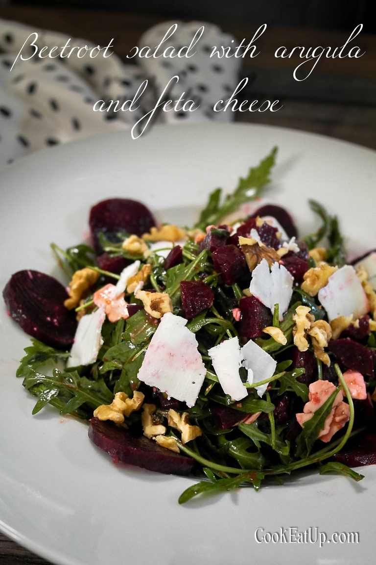 In a large bowl, combine the beetroots, arugula, and most of the feta (reserve a bit for garnish). Pour the vinaigrette over the salad and toss well to coat. Sprinkle with the remaining feta and walnuts on top. Serve immediately and enjoy!