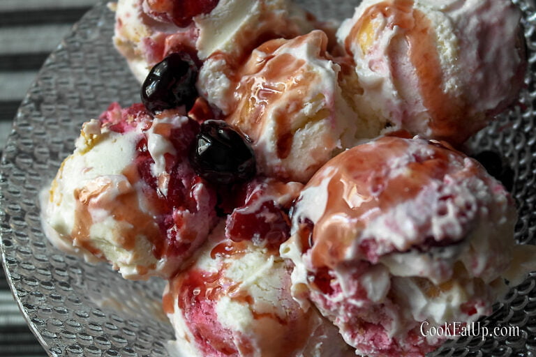 Put the ice cream in a container with a lid or a mould covered with plastic wrap if you want to cut it into slices. Reserve 2-3 tablespoons of the cherry sauce and spread the rest on top. Carefully, dip the cherries into the ice cream and pour the reserved sauce over the top. Use a knife to slightly stir the syrup over the surface to form pretty lines.