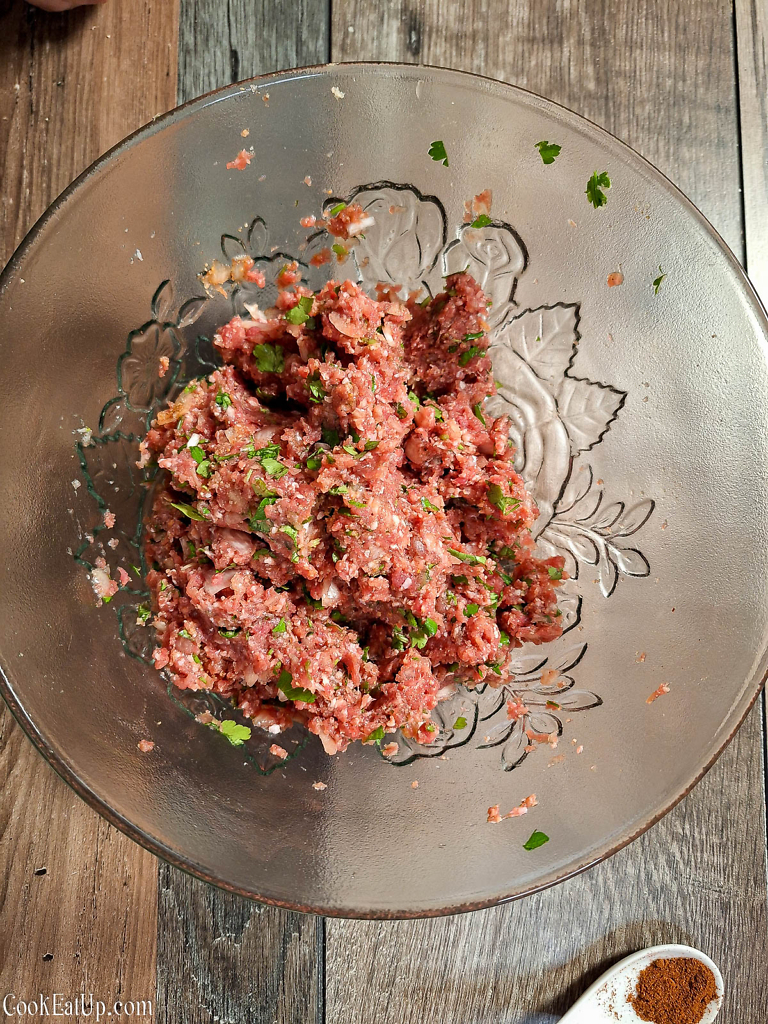 Chop the onions and parsley, add to the ground beef with all other ingredients.