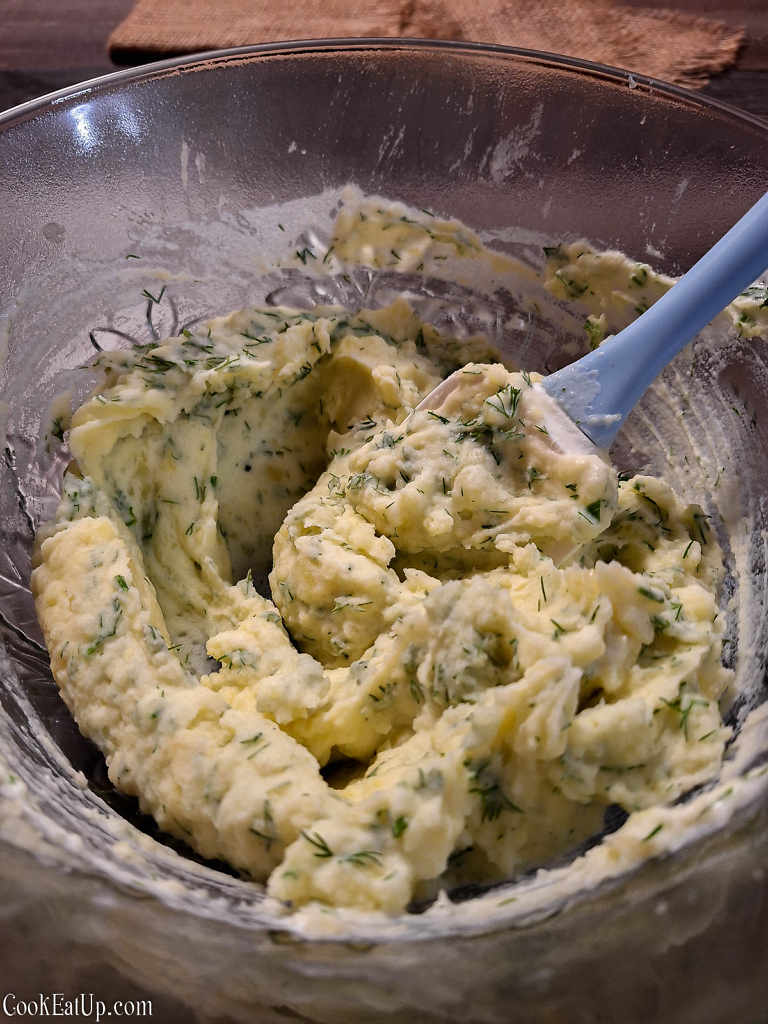 Drain, mash while hot, and mix with butter, cream, dill, salt & pepper.
