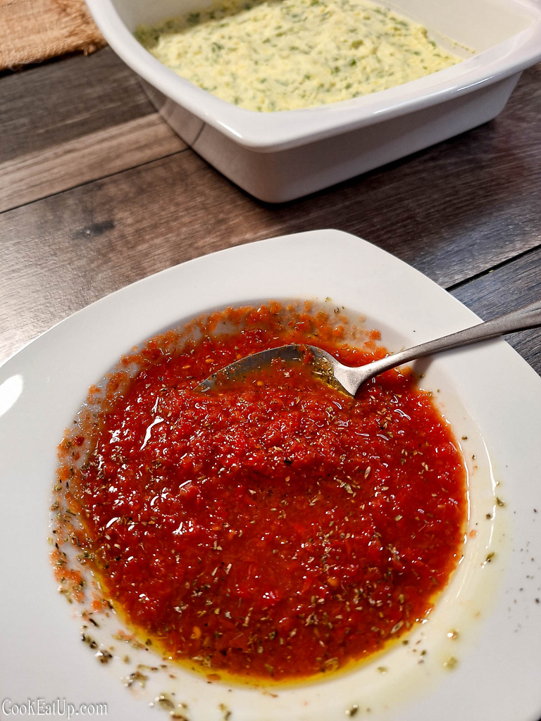 Mix tomato sauce, olive oil, oregano, salt & pepper.