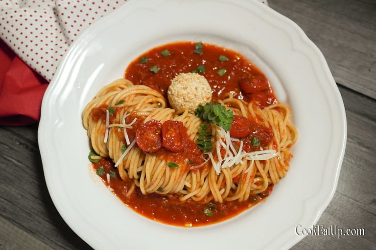 Μεγάλη αδυναμία είχα σ΄αυτή τη μακαρονάδα από μικρή. Υπήρχε ένα μαγαζάκι στη Στοά Μοδιάνο εδώ στη Θεσσαλονίκη, ένα μικρό μαγειρείο με λιγοστά τραπέζια όπου έφτιαχνε αυτή τη σάλτσα δηλαδή ντομάτα και πιπεριά -το απόλυτο τίποτα αν το καλοσκεφτείς- και μέσα έριχνε κοφτό μακαρονάκι. Με πήγαινε ο μπαμπάς μου εκεί μικρούλα και θυμάμαι να περιμένω ανυπόμονα μέχρι να έρθει το πιάτο μπροστά μου και τον ενθουσιασμό μου καθώς τα υπέροχα αρώματα της σάλτσας και η ζεστασιά από τα μακαρόνια αναδύονταν αργά και έφταναν στο πρόσωπό μου. Έτρωγα αργά και απολαυστικά με το κουτάλι, ένα ένα μακαρονάκι ρουφώντας την πλούσια σάλτσα που είχε παγιδευτεί μέσα τους κι ούτε μ΄ένοιαζε η ουρά που σχηματίζονταν έξω από το μαγαζί. Έτσι κι αλλιώς αυτό το φαινόμενο ήταν μόνιμο. Απλά πράγματα αλλά στην απλότητα κρύβεται η ομορφιά κι η ευτυχία…