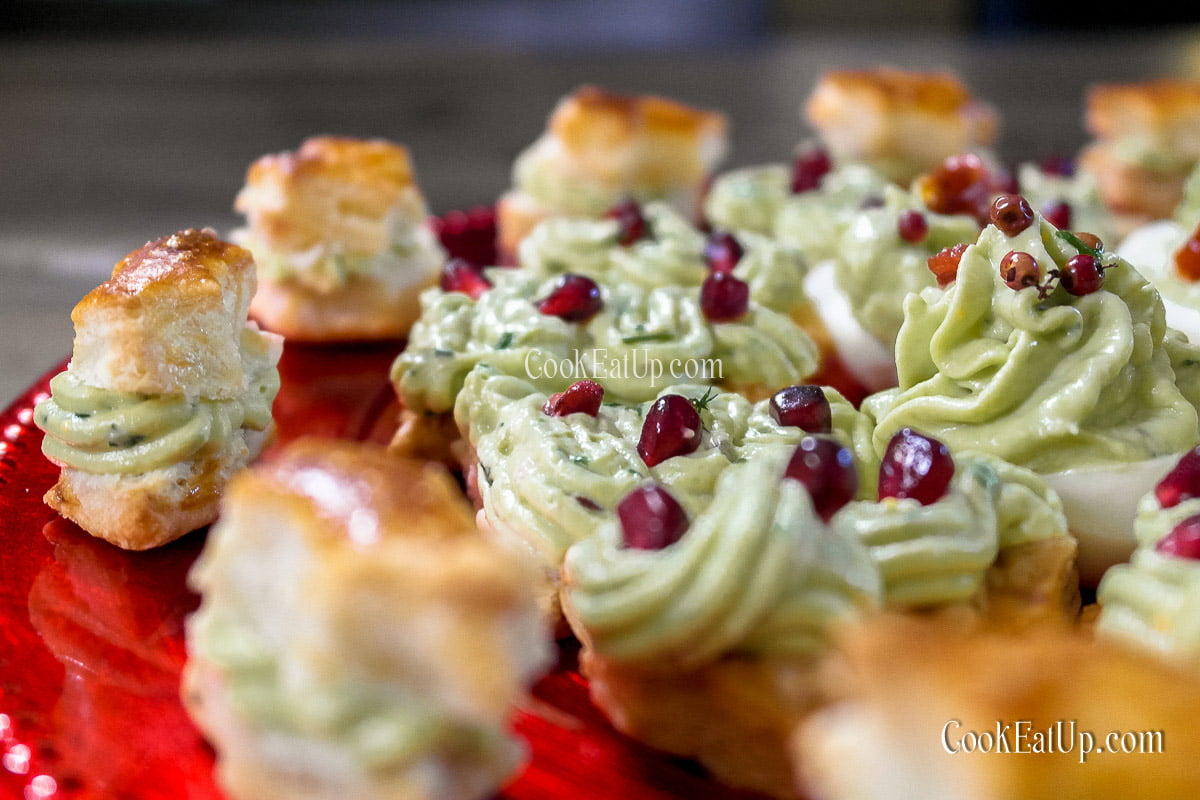 Οδεύουμε ολοταχώς προς τα Χριστούγεννα και είναι ώρα να σχεδιάσουμε το εορταστικό μενού μας. Την προηγούμενη φορά φτιάξαμε γουακαμόλε και ο λόγος ήταν πως σήμερα θα σας προτείνω μια πιατέλα ορεκτικών με βάση αυτή την υπέροχη σαλάτα. Και μπορεί να είναι ξενόφερτη και να μην έχει σχέση με το παραδοσιακό ελληνικό τραπέζι των Χριστουγέννων, όμως παρ΄όλα αυτά παραμένει μια δροσερή κι ελαφριά σαλάτα που σαν ορεκτικό στέκεται άψογα στο ύψος των περιστάσεων αφού ανοίγει την όρεξη και μας προετοιμάζει για το γεύμα που θα ακολουθήσει χωρίς να μας βαραίνει. Το άλλο πλεονέκτημά του είναι το πράσινο του χρώμα που μας βοηθάει να διακοσμήσουμε καναπεδάκια με σχήμα έλατο ή φύλλο γκι. Καναπεδάκια λοιπόν και αυγουλάκια με πάστα γουακαμόλε και να έχετε χαρούμενα Χριστούγεννα!
